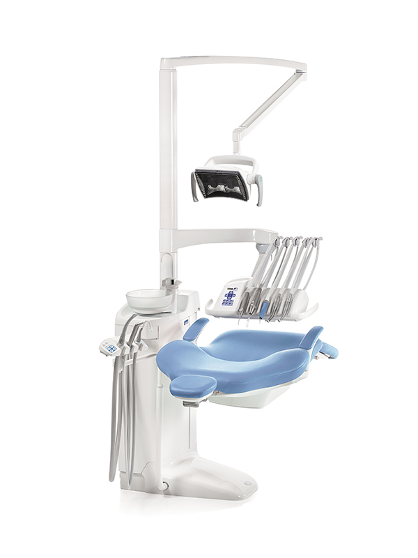 Op de vloer geplaatste spittoonconsole met vrij hangende behandelstoel en een tandartselement met 5 gewicht ontlastende zweeparmen met lange (520mm) achterarm. Vier behandelposities zijn programmeerbaar.